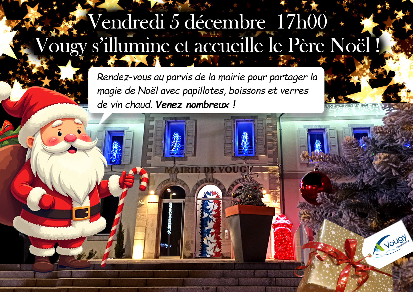 Présence du Père Noël, papillotes, boissons et verres de vin chaud.